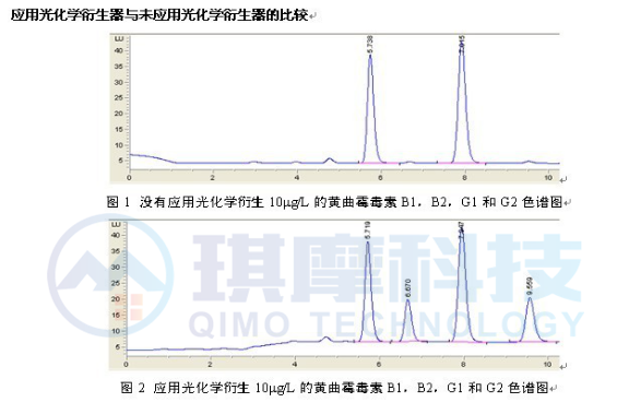 由于黃曲霉毒素 B1和 G1 本來具有較強(qiáng)的熒光性,但接觸水以后,發(fā)生熒光的淬滅現(xiàn)象,熒光性基本消失,很難用液相色譜檢測出來,所以我們可以采用衍生的方法使黃曲霉 B1 和 G1 的熒光性增強(qiáng)。目前衍生的方法主要有三氟乙酸衍生法,碘衍生法等。三氟乙酸衍生法,操作步驟繁瑣,試驗(yàn)重復(fù)性很差,而且三氟乙酸毒性很強(qiáng);碘衍生法,需要柱后衍生泵,還要配制碘衍生液,操作也很繁瑣。而本光化學(xué)衍生器不需要任何化學(xué)試劑,直接連接于色譜柱與熒光檢測器之間,操作簡單,檢測結(jié)果準(zhǔn)確,靈敏度高。